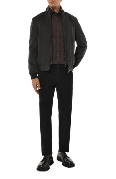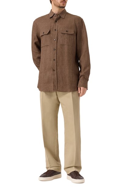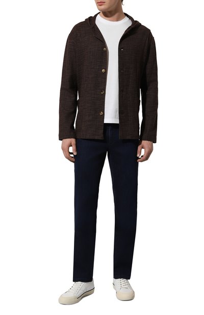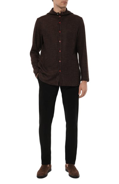 Рубашка с капюшоном и накладными карманами застегивается роговыми пуговицами. Для изготовления модели использовали шерстяную фланель.