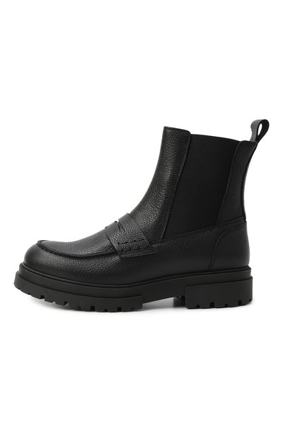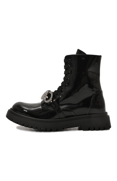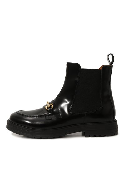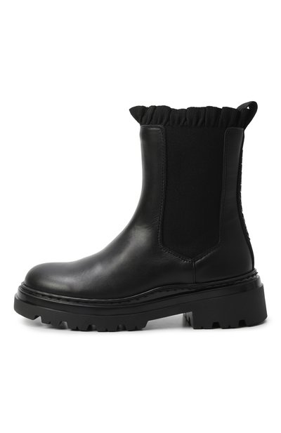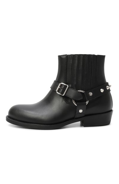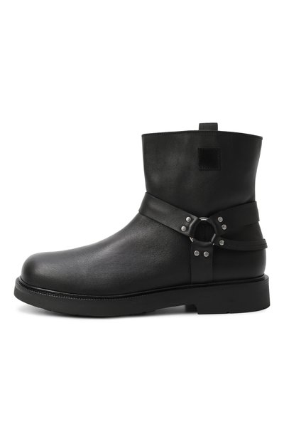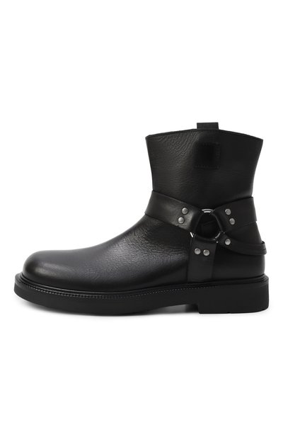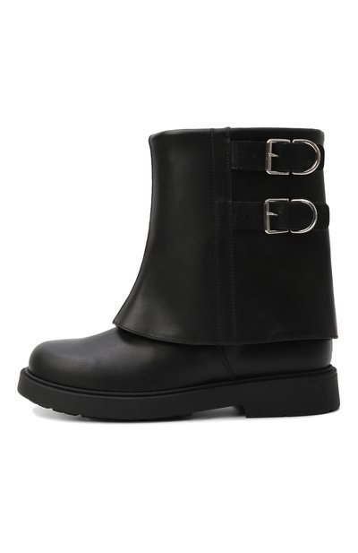Полусапоги с круглым мысом и боковой молнией выполнили из гладкой кожи, а широкую подошву изготовили из термопластичной резины. Голенище модели дополнили слегка расклешенным отворотом с двумя ремешками.