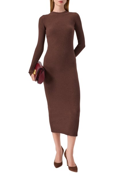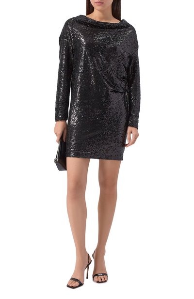 Платье Eviba с графичным принтом выполнили из плиссированного полиэстерового тюля с добавлением эластана. Модель с высоким цельнокроеным воротом дополнили подкладом.
