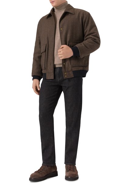Высокие ботинки с боковой молнией на облегающем голенище выполнили из замши с потертостями и темной патиной. Модель на широкой протекторной подошве декорировали сзади фирменным крупным стежком.