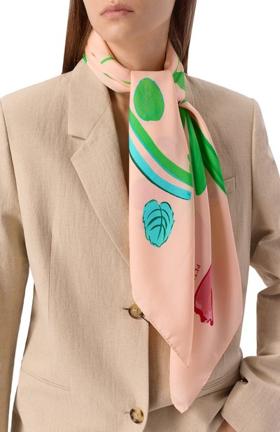 Шарф-твилли из шелка с цветочным принтом добавит образу ярких красок. Концы аксессуара подчеркнули полоской и изображением фирменной двухслойной пластины.