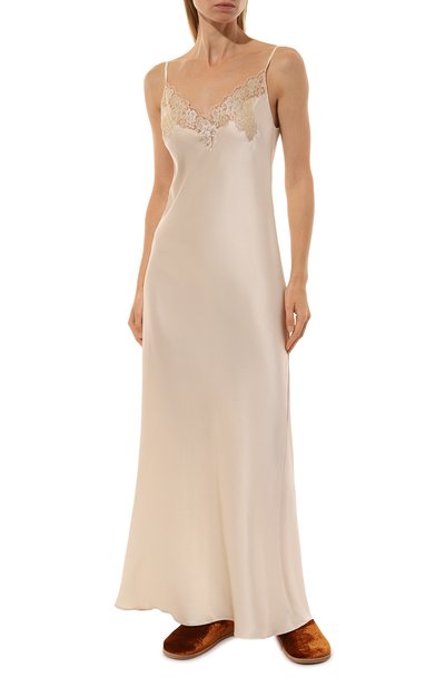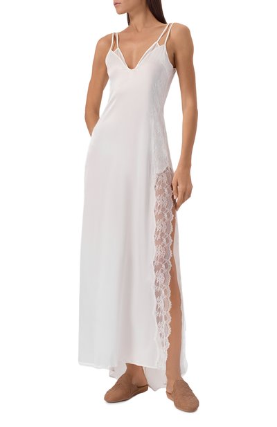 Сорочку с двойными узкими бретелями и асимметричным подолом, дополнен ным высоким разрезами, сшили из эластичного шелкового атласа. Модель с тюлевыми вставками на лифе декорировали цветочным кружевом по бокам.