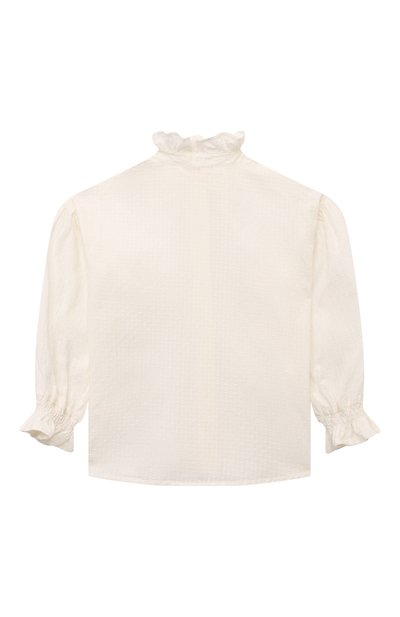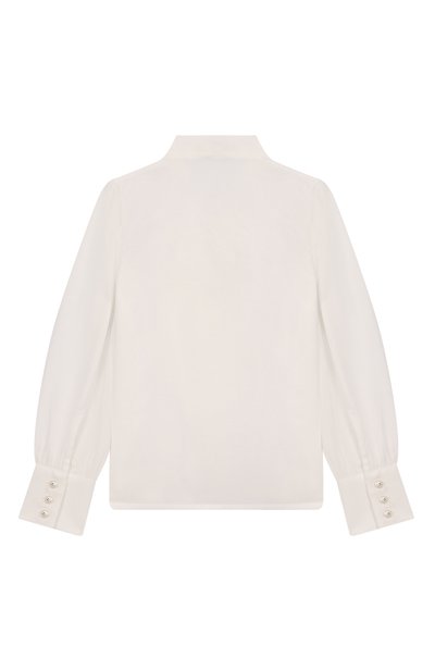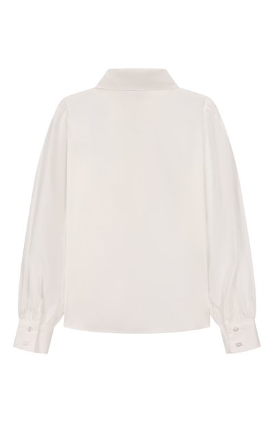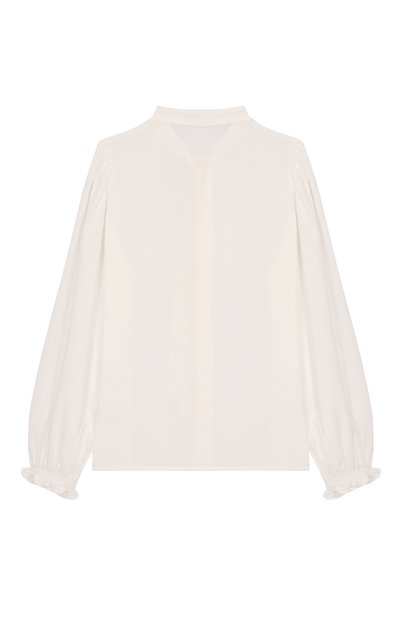 Для изготовления блузы использовали шелковистую вискозу. Модель с объемными рукавами и оборками на эластичных манжетах дополнили на воротнике-стойке лентами, которые можно завязать бантом.