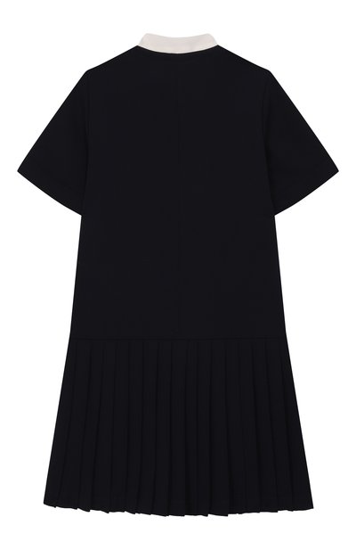 Платье со складками на подоле выполнили из полиэстера с добавлением вискозы и эластана. Модель с двумя нагрудными листочками застегивается пуговицами с геральдической эмблемой марки. В комплекте — контрастный воротник аскот.