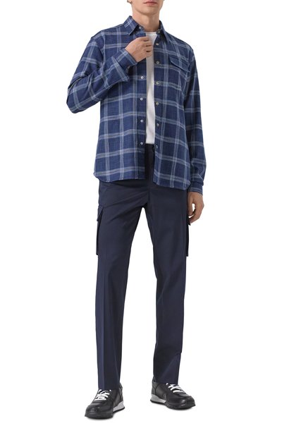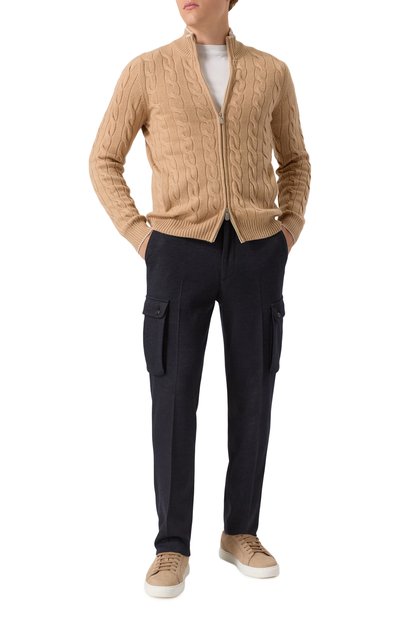 Зауженные брюки со стрелками сшили из шерстяной фланели. Модель со средней посадкой дополнили четырьмя врезными карманами и двумя карго с клапанами.