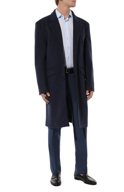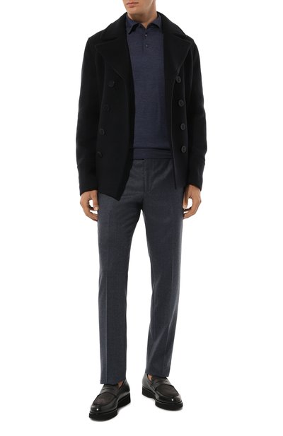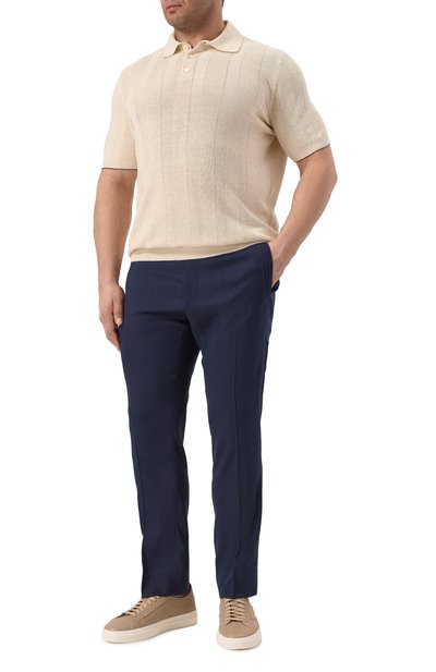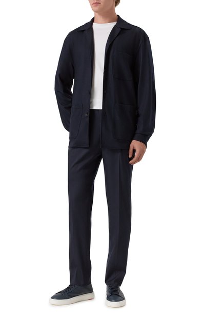 Брюки с защипами, стрелками и четырьмя карманами выполнили из шерстяной фланели. Посадка модели регулируется шнурком, продетым в эластичный пояс-кулиску.