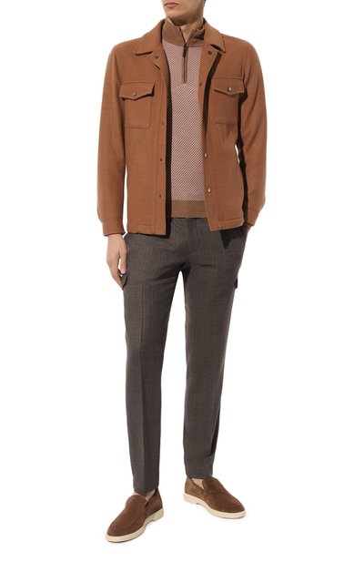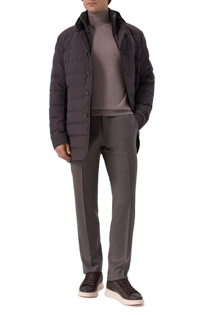 Прямые брюки с микроузором выполнили из шерсти с небольшим добавлением эластана. Модель с нашивкой на поясе дополнили двумя парами карманов.