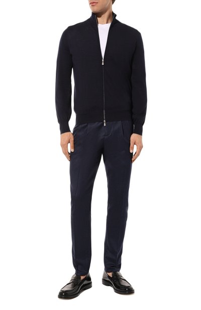 Брюки с проглаженными стрелками и складками спереди выполнили из костюмной шерсти. Модель с четырьмя карманами может стать основой образа в стиле smart casual.