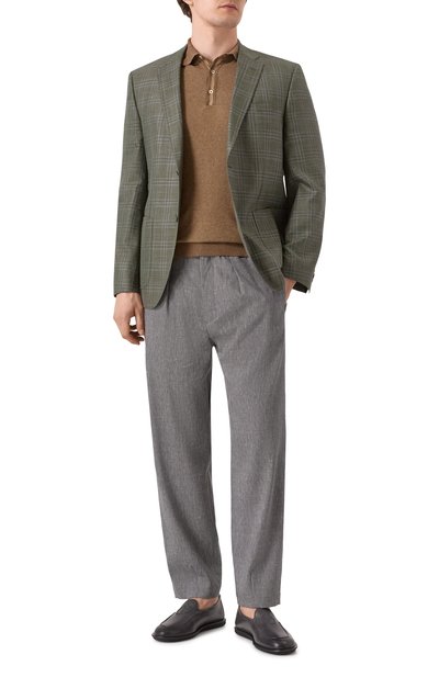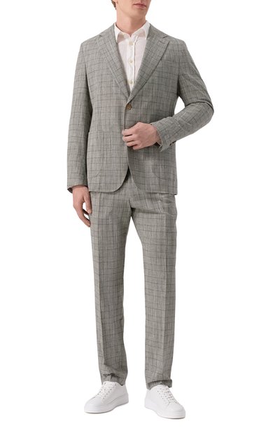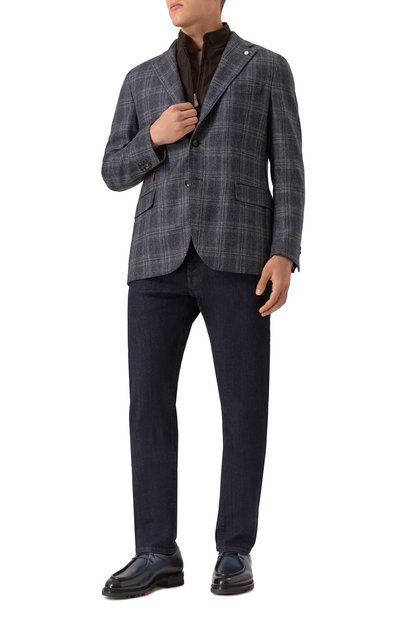 Клетчатый пиджак с подкладом выполнили из шерстяной ткани. Модель с двумя шлицами сзади дополнили нагрудным и парой боковых карманов.