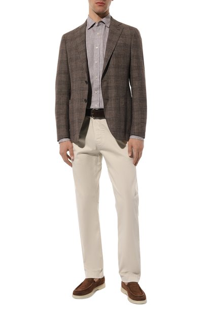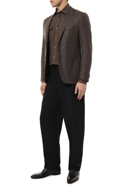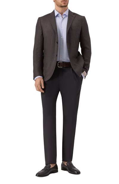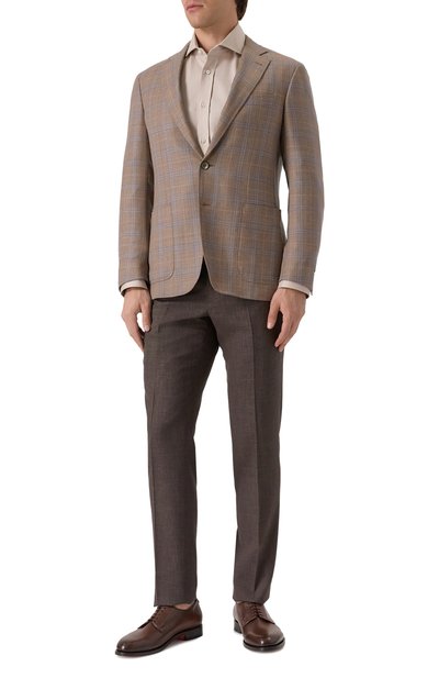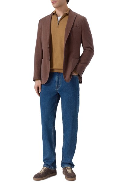 Однобортный пиджак с широкими лацканами и двумя шлицами сшит из шерсти с добавлением кашемира. Модель с подкладом из купро дополнена врезным и парой накладных карманов.