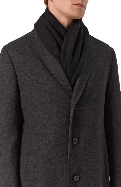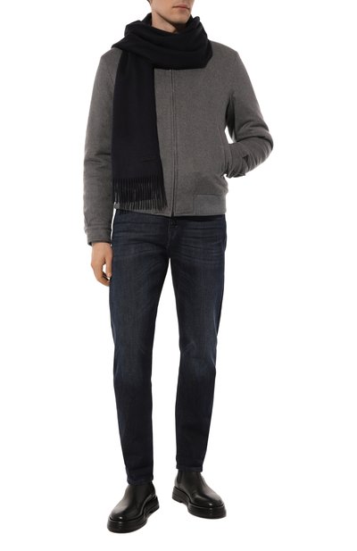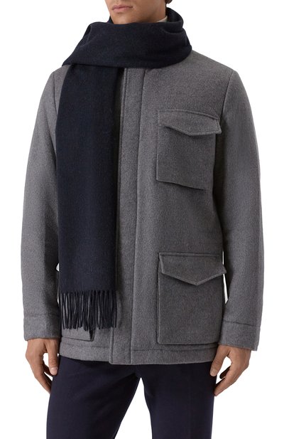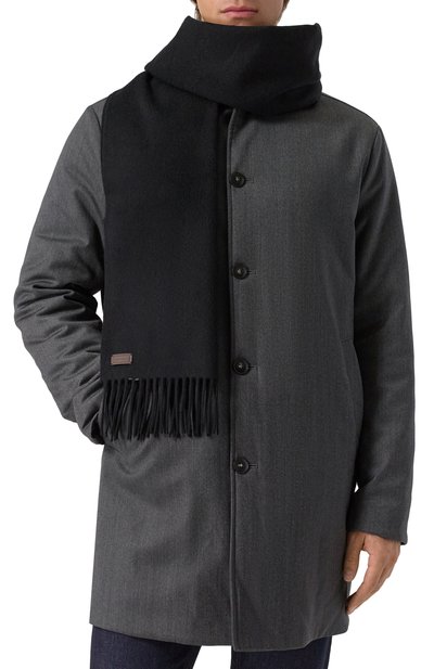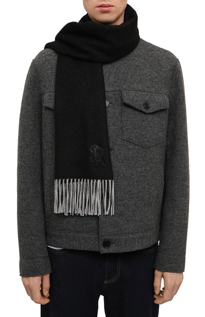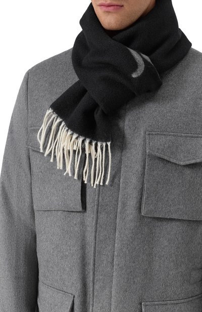 Шарф с бахромой и вышитым логотипом марки выполнен из кашемира. Длина аксессуара позволяет несколько раз обернуть его вокруг шеи или завязать объемный узел.