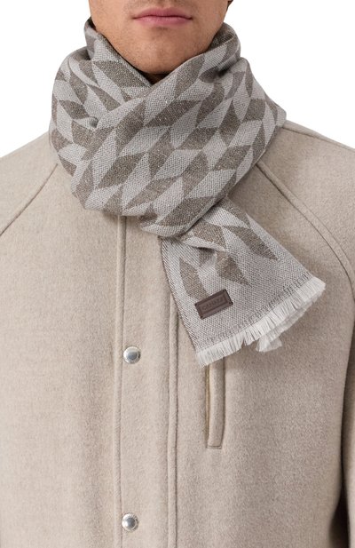 Клетчатый шарф с короткой бахромой по краям выполнили из фактурной шерсти. Аксессуар, длины которого хватит, чтобы несколько раз обернуть вокруг шеи, украсили вышитым логотипом марки.