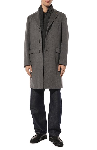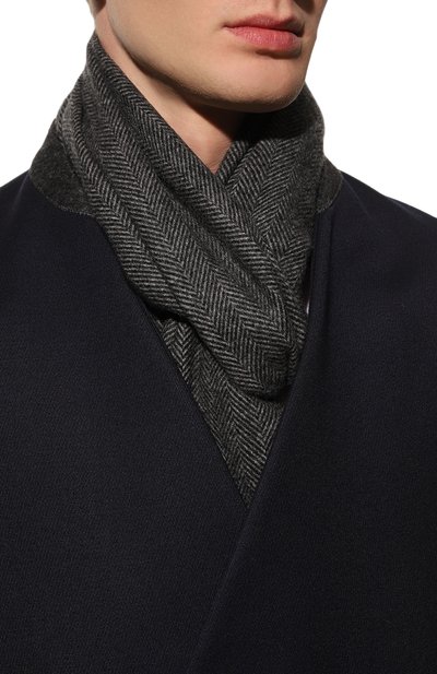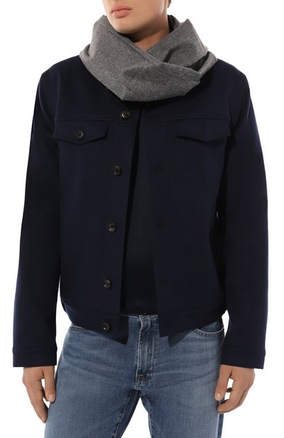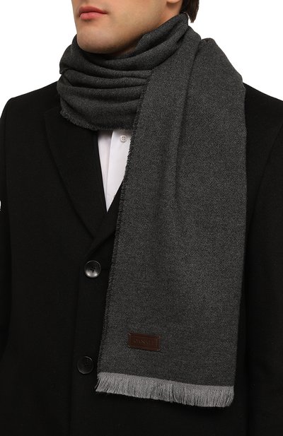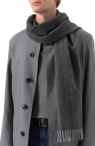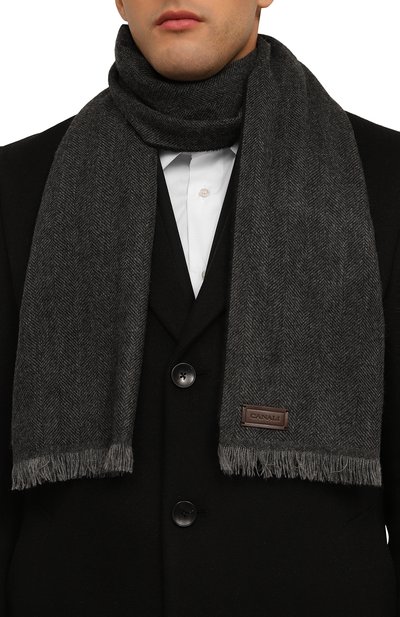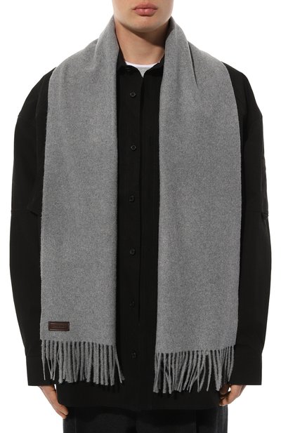 Для создания шарфа с короткой бахромой по краям использовали шерстяную пряжу. Аксессуар с рельефным узором украсили логотипом марки, вышитым нитью в тон.
