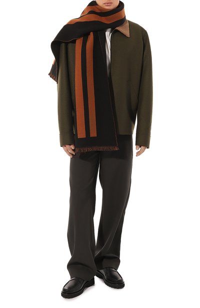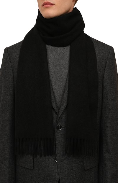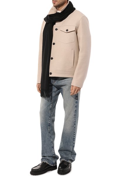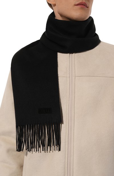 Широкий шарф с бахромой и вышитым логотипом бренда выполнили из мягкого кашемира. Длина аксессуара позволяет несколько раз обернуть его вокруг шеи или завязать объемный узел.