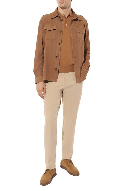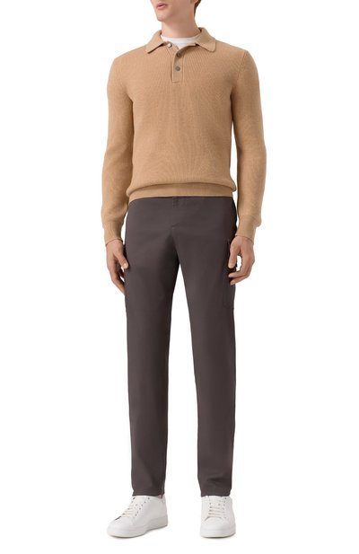 Поло с отделкой в рубчик выполнили из тонкого шерстяного трикотажа. Модель с потайной молнией декорировали спереди вышитой в тон эмблемой марки.