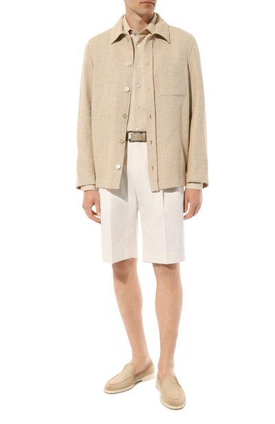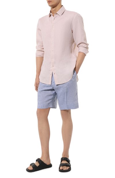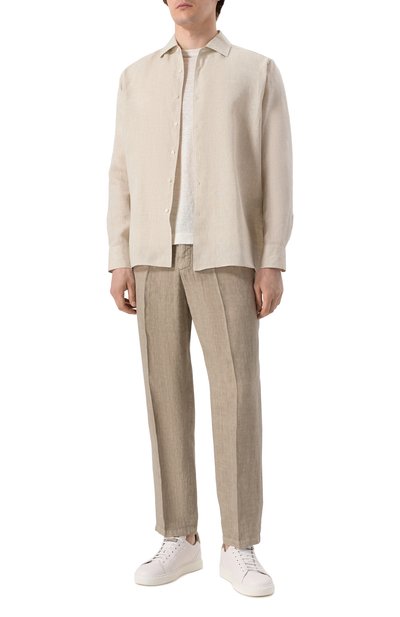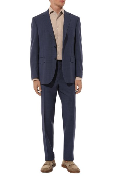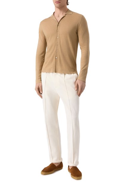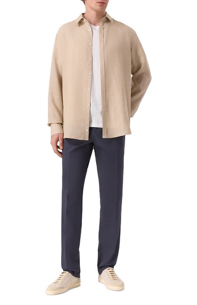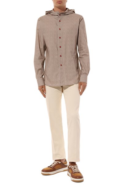 Для изготовления рубашки с закругленными низом и манжетами использовали хлопок oxford с добавлением кашемира. Модель застегивается фирменными перламутровыми пуговицами.