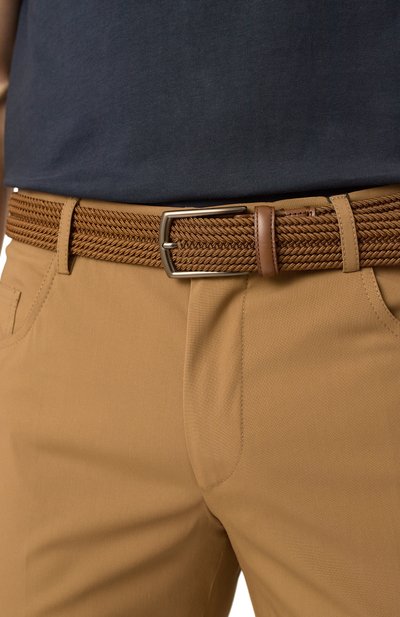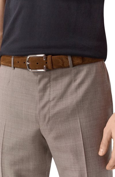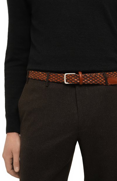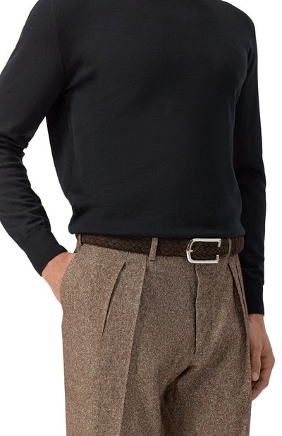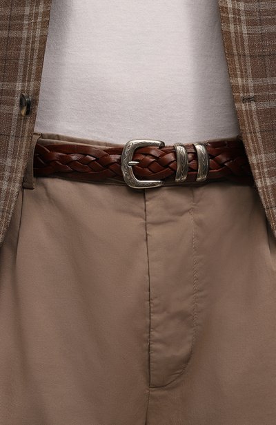 Ремень с зауженным концом сплели из узких полос кожи. Из нее же выполнили брендированную накладку, на которой закрепили фигурную пряжку в форме литеры С.