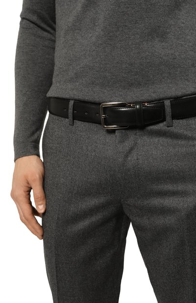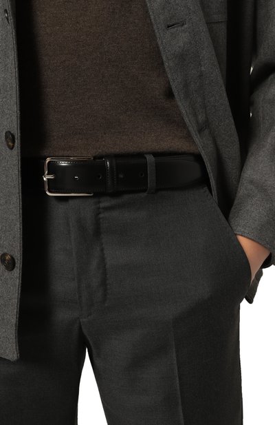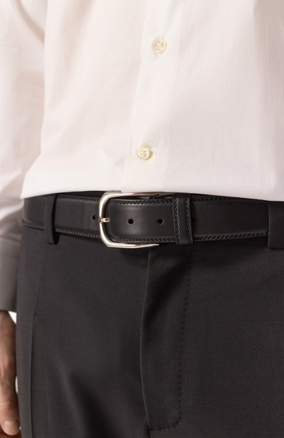 Для изготовления ремня стандартной ширины использовали мягкую наппу. Аксессуар с кожаным тренчиком и квадратной серебристой пряжкой украсили металлической пластиной с выгравированным логотипом.