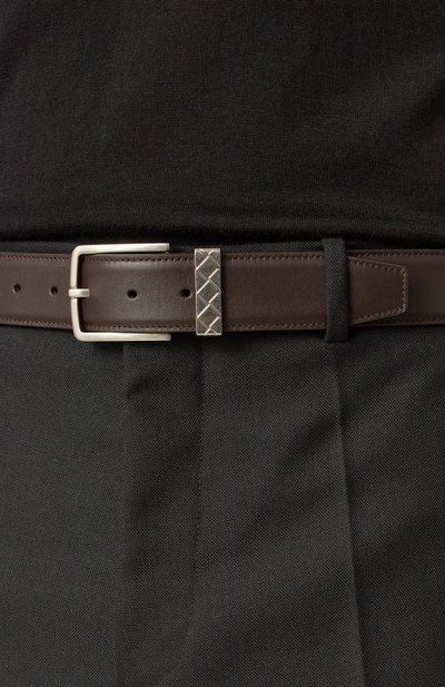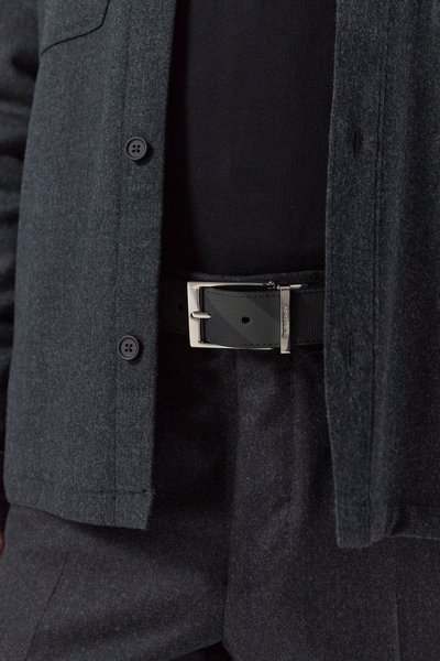 Двухсторонний ремень стандартной ширины выполнили из сафьяновой телячьей кожи. Аксессуар застегивается фигурной серебристой пряжкой с интегрированным тренчиком, декорированным выгравированным логотипом.