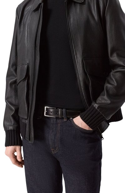 Ремень изготовили из тщательно выделанной гладкой кожи. Аксессуар с металлической закругленной пряжкой украсили пластиной с выгравированным логотипом.