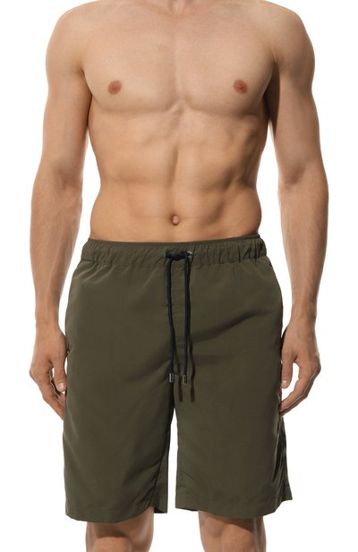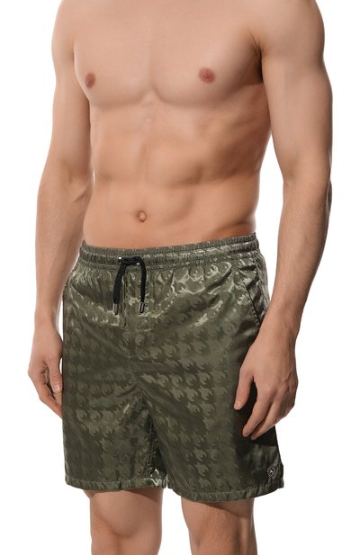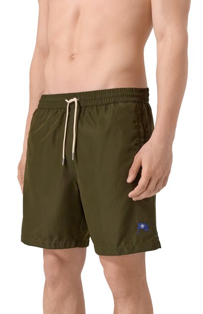 Плавки-шорты выполнили из быстросохнущего полиэстера. Модель дополнили четырьмя карманами, украсив клапан заднего вышитым логотипом, а монетного — брендированной заклепкой фирменного алого оттенка. Посадка регулируется шнурком, продетым в пояс-кулиску.