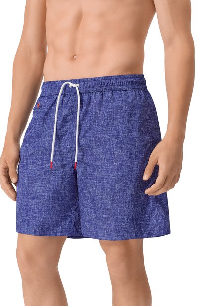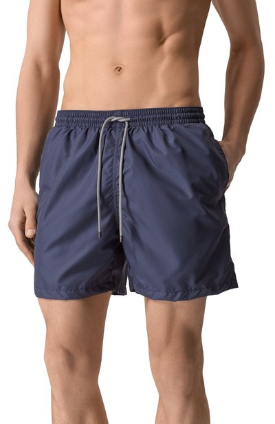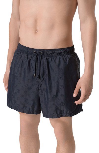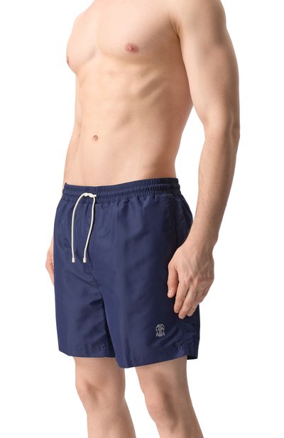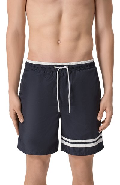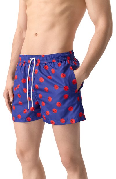Плавки-шорты с кнопкой фирменного алого оттенка на клапане самого маленького из четырех карманов украсили контрастным логотипом сзади. Модель из полиэстера дополнили поясом-кулиской и металлическими люверсами.