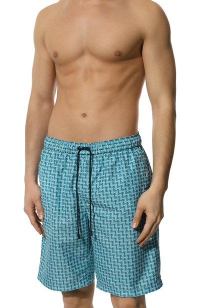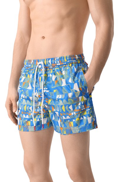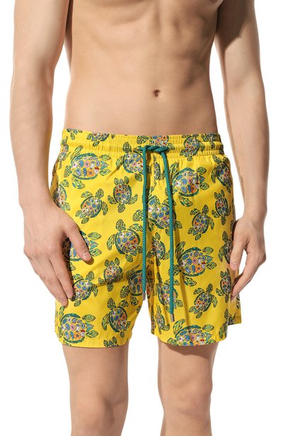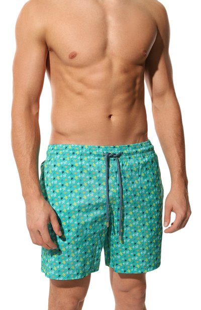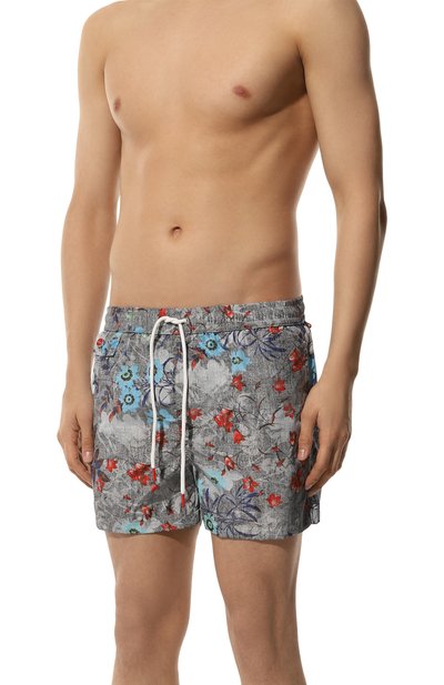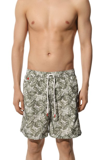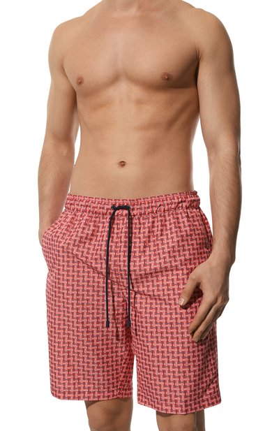 Плавки-шорты с эластичным поясом-кулиской, задним накладным, монетным и боковыми карманами выполнили из полиэстера с растительным мотивом. Из декора — вышитый логотип сзади и кнопка фирменного алого оттенка на клапане спереди.