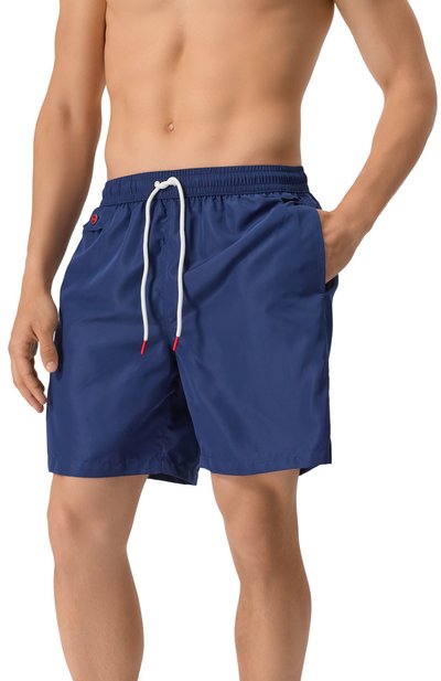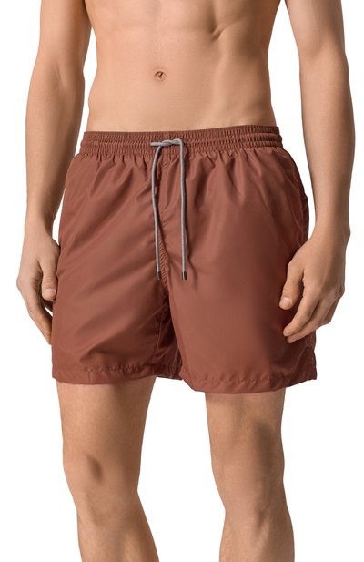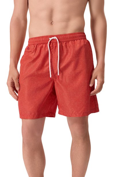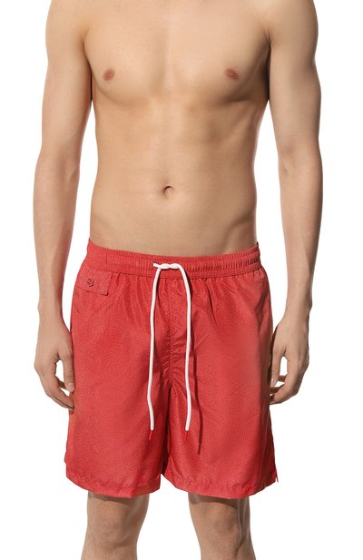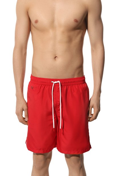 Плавки-шорты из полиэстера дополнили четырьмя карманами и эластичным поясом-кулиской. Модель с регулируемым поясом-кулиской украсили контрастным логотипом сзади и кнопкой фирменного алого оттенка на клапане спереди.