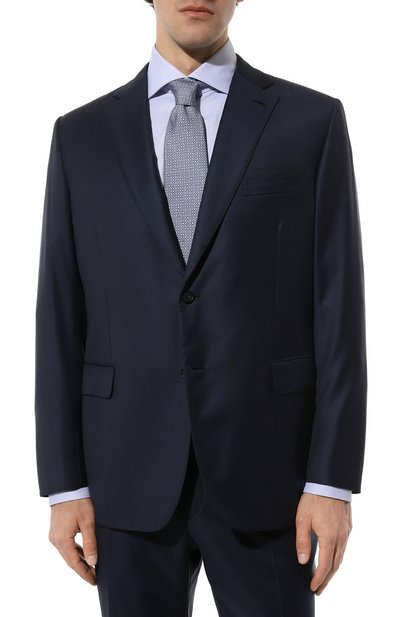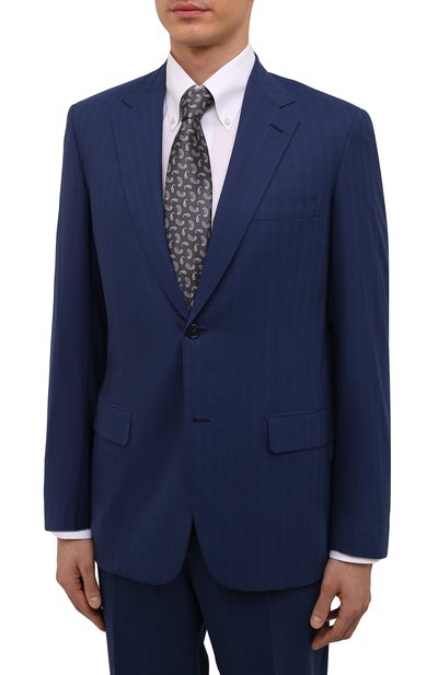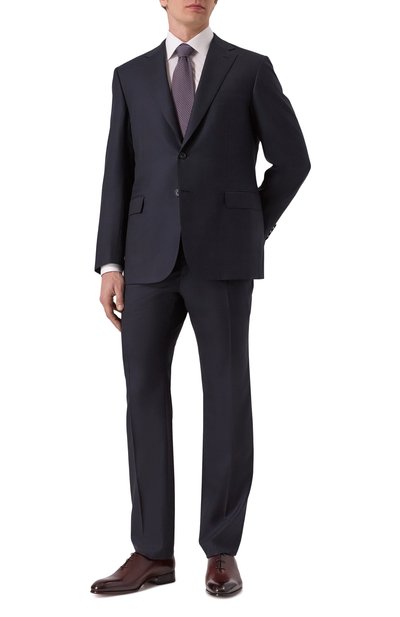 Для создания костюма выбрали чистую шерсть в фактурную вертикальную полоску. Однобортный пиджак облегченной конструкции дополнили двумя шлицами сзади и тремя карманами, а брюки — отутюженными стрелками и двумя парами карманов.
