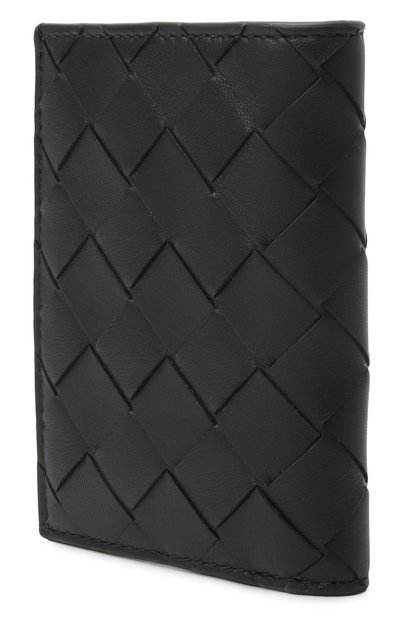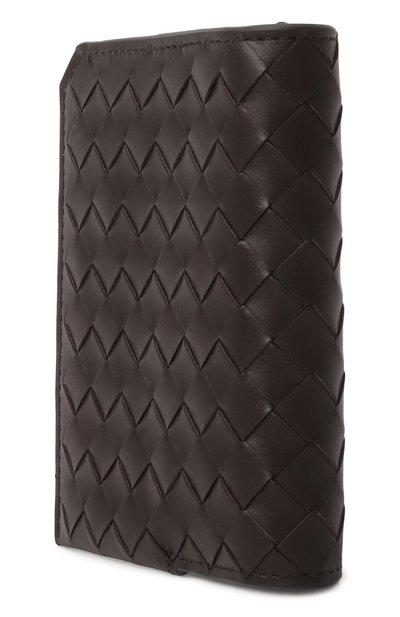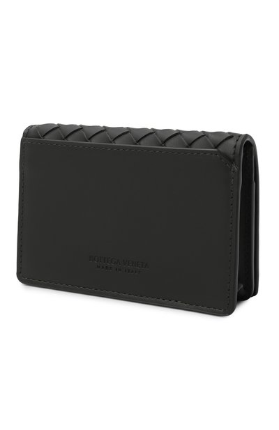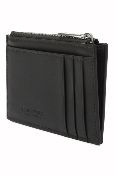 Футляр оттенка Fondant выполнили из зернистой и гладкой телячьей кожи, сплетя переднюю панель в фирменной технике intrecciato. Модель с тремя карточными слотами дополнили центральным открытым карманом.