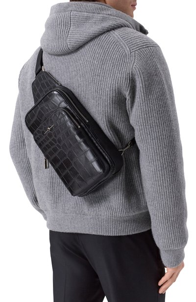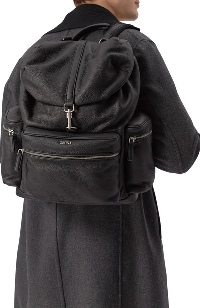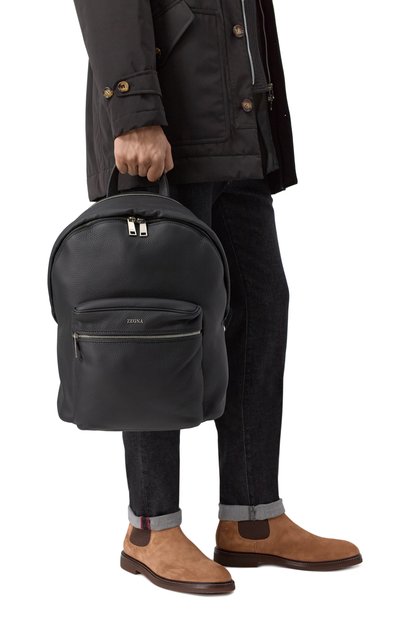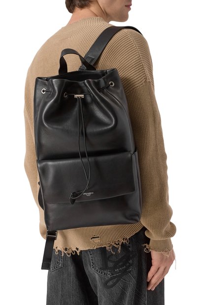 Рюкзак с короткой ручкой дополнили объемным внешним карманом и внутренним отделением для ноутбука. Аксессуар сплели в технике intrecciato из телячьей кожи.