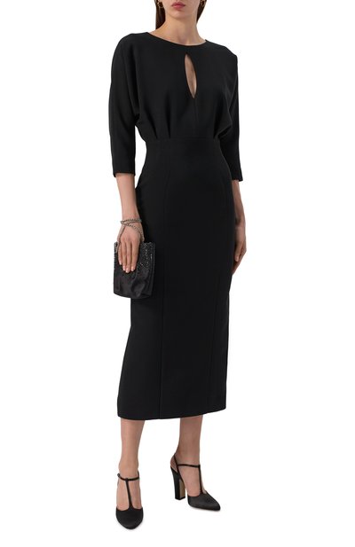 Для пошива платья с пуговицей на горловине сзади использовали шелк. Спинку изделия украсили крупным каплевидным вырезом, ниже которого сформировали драпировку и вертикальный волан.
