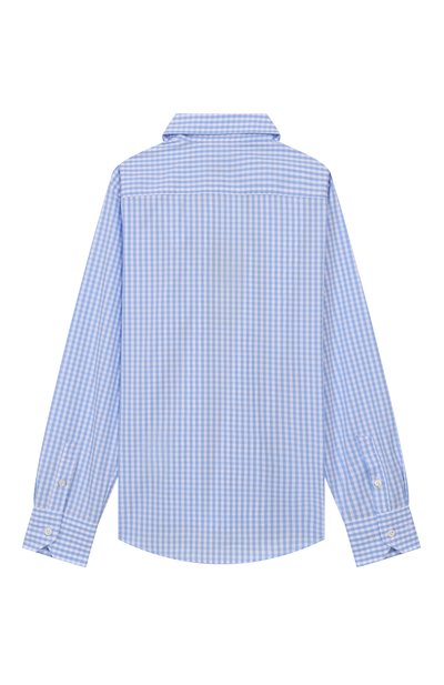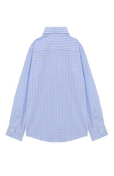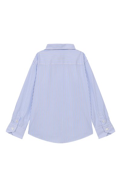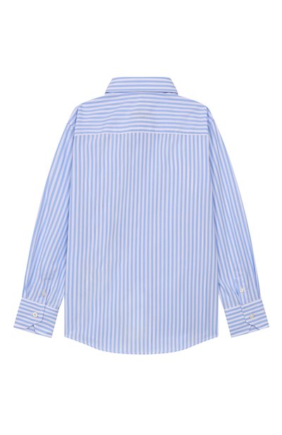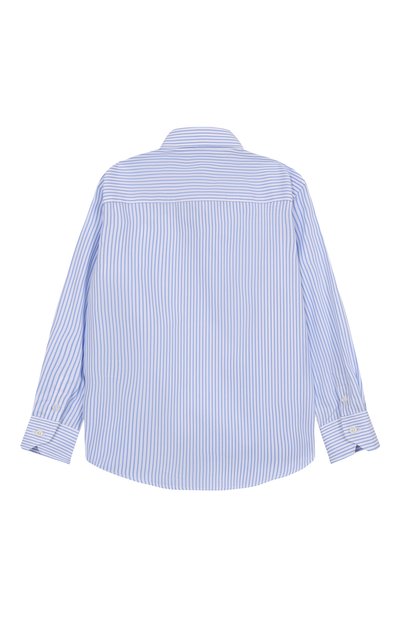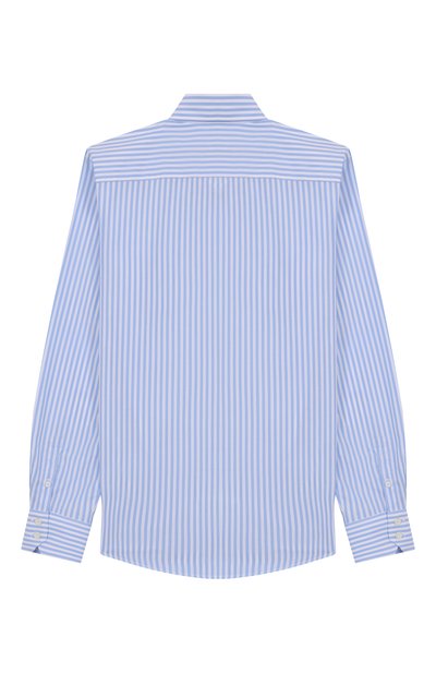 Рубашку с отложным воротником и фигурным низом выполнили из хлопковой ткани в узкую полоску. Модель с фирменными перламутровыми пуговицами декорировали вышитой монограммой на одной из скошенных манжет.