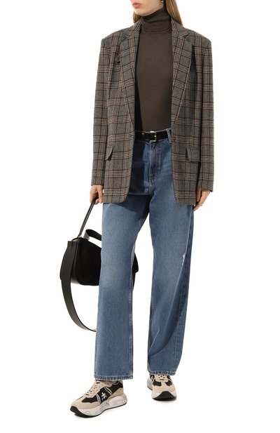 Кроссовки из микса кожи, замши и текстиля прошили контрастной нитью. Язычок модели на массивной протекторной подошве украсили патчем со знаковым числовым кодом, а задник дополнили фирменной белой строчкой.