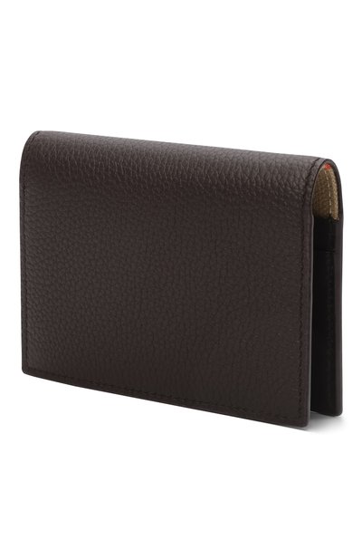 Футляр с тремя слотами для карт и карманом выполнили из зернистой телячьей кожи. Аксессуар с застежкой на кнопку украсили фирменным числовым кодом внутри и знаковыми стежками на передней панели.