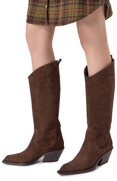 Казаки Hilda из вощеной телячьей замши оттенка Ebony установили на выступающую кожаную подошву и низкий каблук. Широкое голенище модели украсили петлями по бокам и вышивкой в стиле вестерн.
