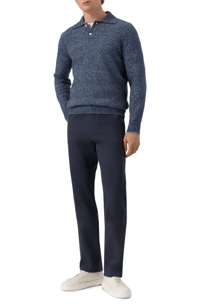 Поло на двух брендированных пуговицах связали арановым узором из тонкой кашемировой пряжи. Эластичные манжеты подчеркнули контрастной полоской, а пояс в рубчик и гладкий воротник оставили без акцентов.