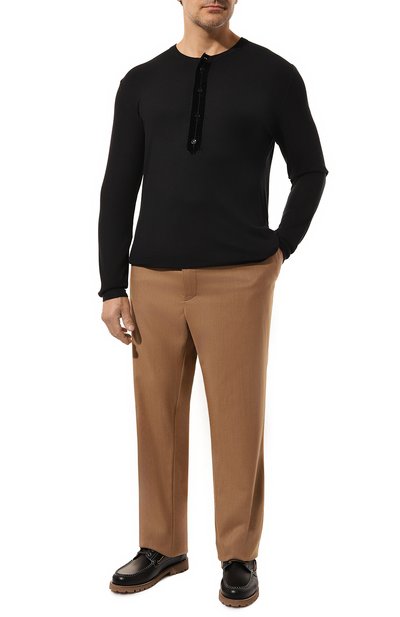 Для пошива джемпера кроя Regular fit выбрали трикотаж с «вафельной» фактурой, выполненный из хлопка и шелка. Модель с невысоким воротником-стойкой застегивается тремя пуговицами на короткой планке.