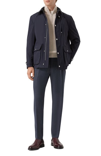 Куртку со съемным ремешком на воротнике с вельветовой отделкой выполнили из влагоотталкивающего стрейчевого нейлона с мембраной. Модель с двумя внутренними карманами и держателем для ручки, а также с тремя внешними карманами застегивается молнией и штормовой кнопочной планкой.