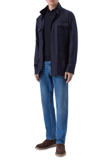 Куртку со съемным ремешком, трансформирующим вельветовый отложной воротник в стойку, дополнили внутренними и тремя внешними карманами. Модель из шерстяной фланели застегивается молнией, скрытой под штормовой планкой с кнопками.