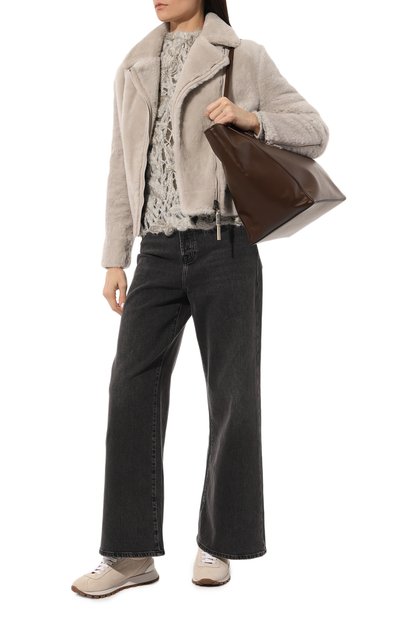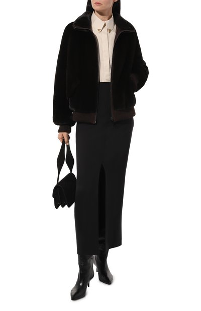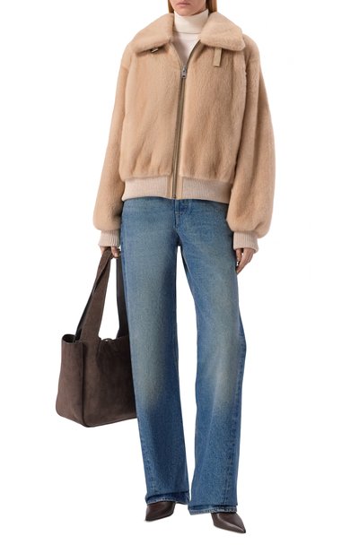 Бомбер с трикотажными манжетами, поясом и воротником выполнили из меха норки, а для подклада использовали шелк. Модель с двумя боковыми карманами застегивается молнией.