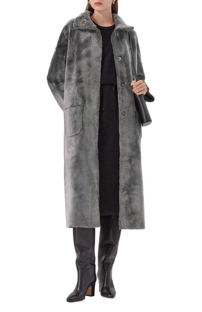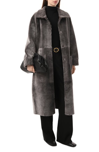 Дубленку с разрезами по бокам, отложным воротником и приспущенной линией плеч выполнили из овчины ягненка. Модель можно носить, вывернув меховой стороной наружу. Изделие на потайных кнопках дополнили парой карманов.