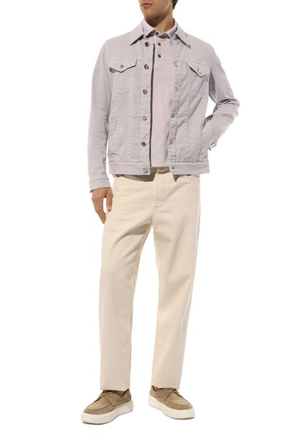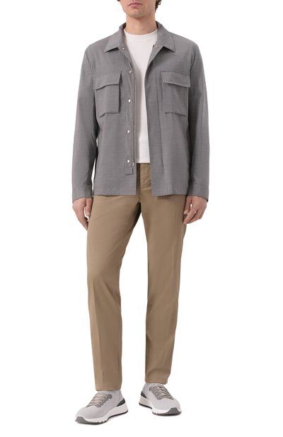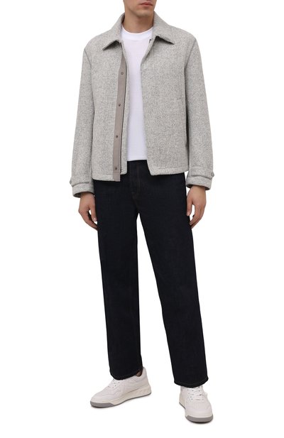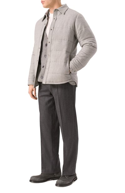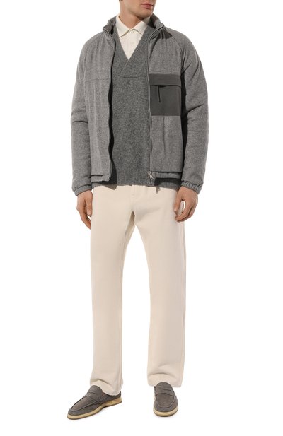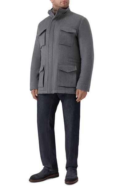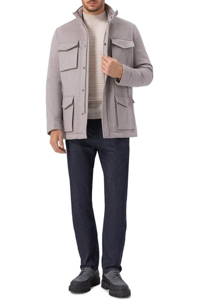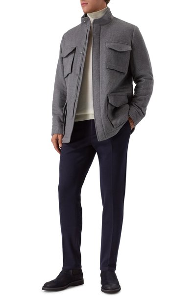 Куртку с высоким воротником, потайной кулиской и четырьмя накладными карманами выполнили из чистого кашемира, утеплив изделие синтепоном. Модель застегивается молнией, скрытой под планкой с кнопками, а прямоугольные манжеты – пуговицами.