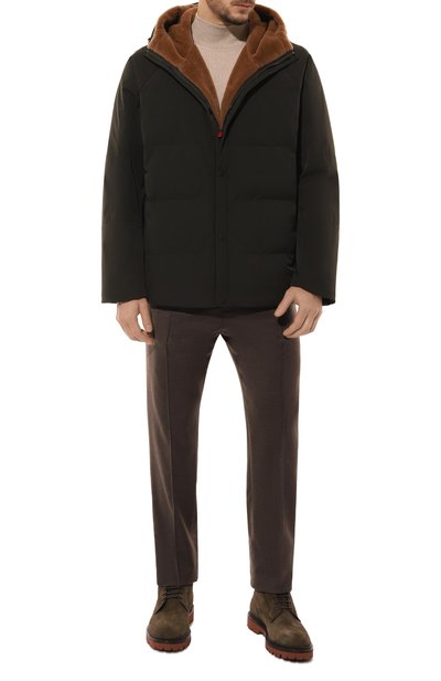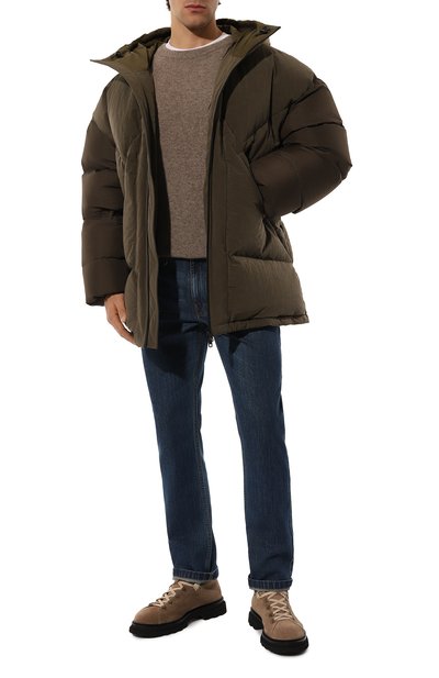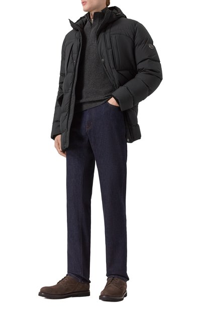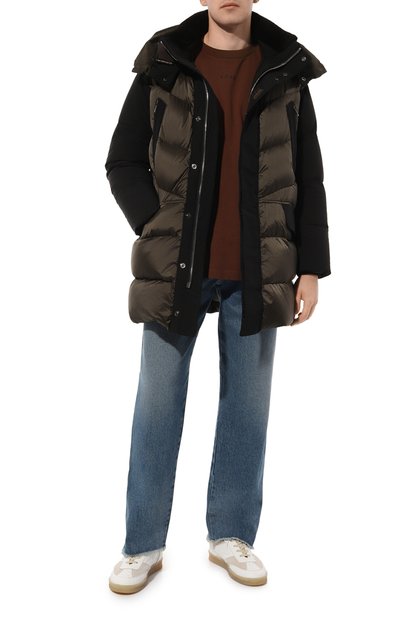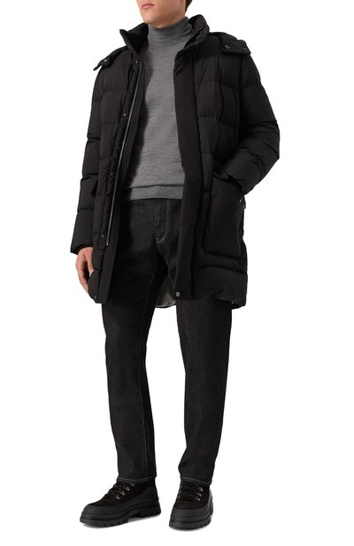 Стеганую куртку с шерстяным подкладом выполнили из полиэстера. Изделие с потайным поясом-кулиской дополнили парой карманов с двумя входами. Модель со съемным регулируемым капюшоном застегивается молнией, скрытой штормовой планкой с кнопками.