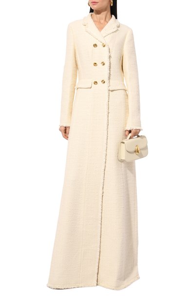 Полупальто с четырьмя врезными карманами сшито из фактурного полушерстяного твида с добавлением шелка, мохера и нитей люрекса. Модель с супатной застежкой отделана по краям густой бахромой.