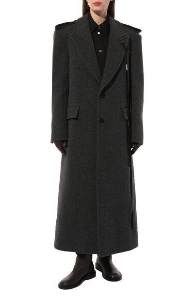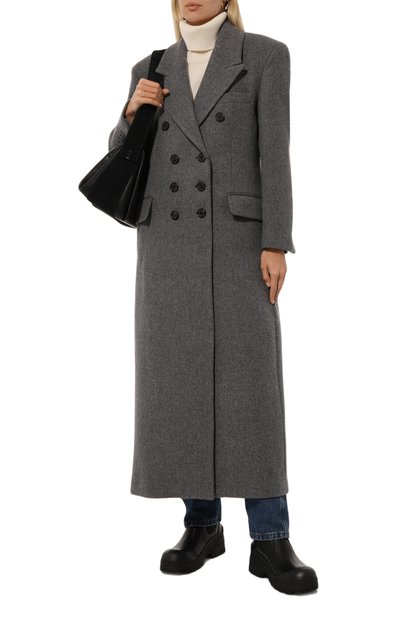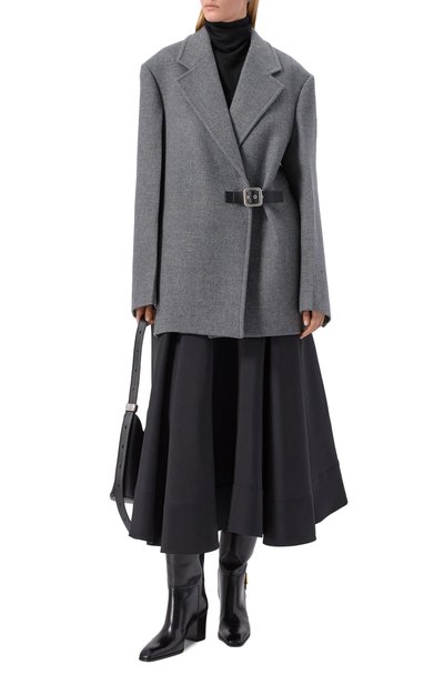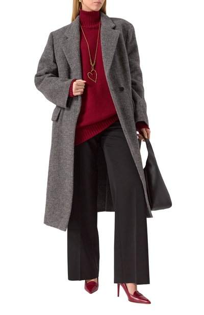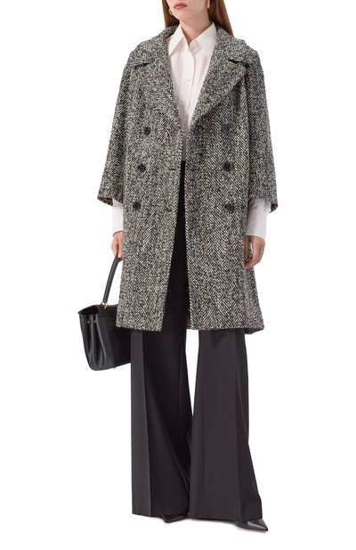 Пальто с отделкой из ленты грогрен по краям выполнили из смеси шерсти и хлопка с добавлением вискозы и полиэстера. Модель с двумя нагрудными листочками дополнили парой боковых накладных карманов.