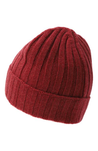 Для создания шапки бини в широкую полоску выбрали пряжу из чистого кашемира. Отворот аксессуара подчеркнули патчем Solomeo Monumental.