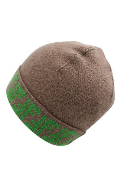 Шапку бини с отворотом выполнили фактурной вязкой из тонкой кашемировой пряжи. Аксессуар декорировали круглым патчем Solomeo Monumental.
