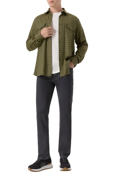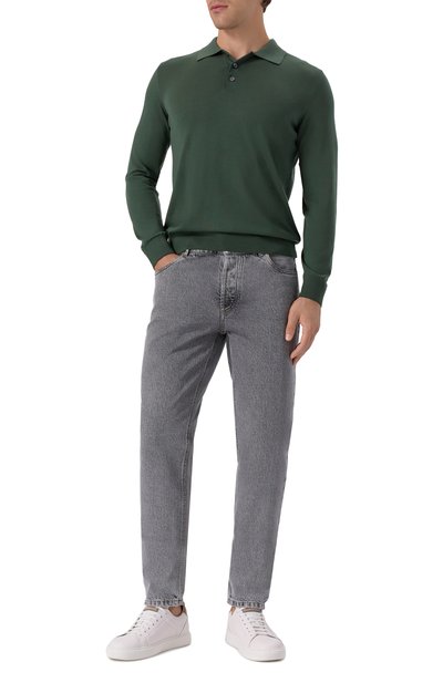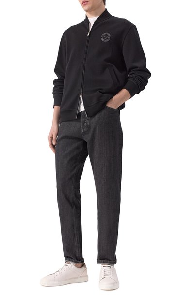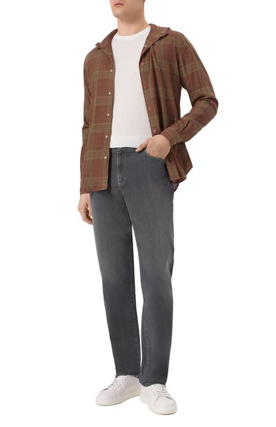 Прямые джинсы будут уместны как в повседневном, так и в нестрогом офисном образе. Модель из хлопкового денима дополнили пятью карманами, подчеркнув монетный вышитой эмблемой Solomeo.