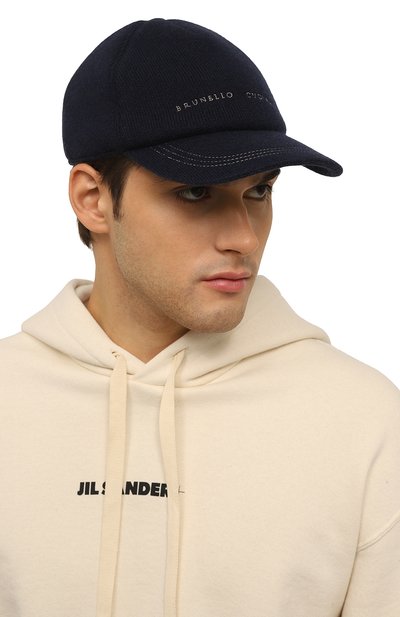Бейсболка из шерстяной фланели украшена спереди вышитой символикой марки. Головной убор с хлопковым подкладом дополнен сзади кожаным ремешком с пряжкой.